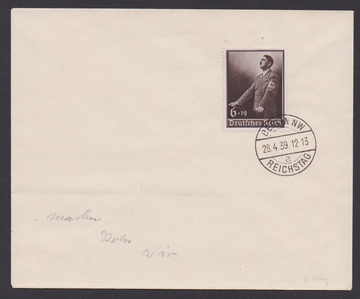 6 + 19 Pfg. Tag der Arbeit auf FDC mit EST "Berlin Reichstag 28.4.39", Mi. 250,-