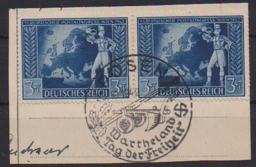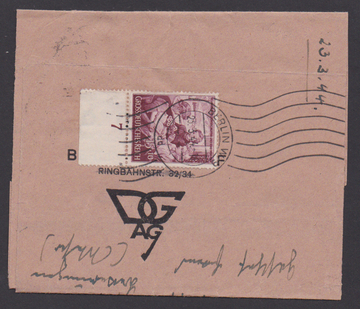 15 + 10 Pfg. Lutter vom Unterrand als sehr seltene Einzelfrankatur rs. auf Bedarfs-Streifband der 5. Gewichtsstufe (!) aus Berlin 1944