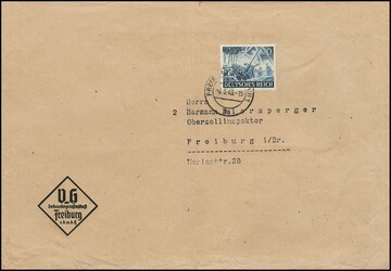 20 + 14 Pfg. WHW als seltene Einzelfrankatur auf Ortsbrief (leichte Mittelfalte ausserhalb) der 4. Gewichtsstufe aus Freiburg 1943