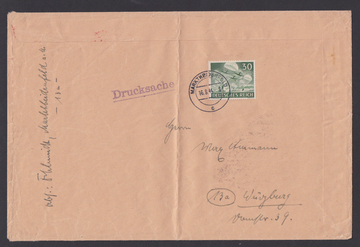 30 + 30 Pfg. WHW als seltene Einzelfrankatur auf Drucksache der 6. Gewichtsstufe (! Couvert dopp. verwendet, Mittelbug ausserhalb) von Marktheidenfeld 1944 nach Würzburg