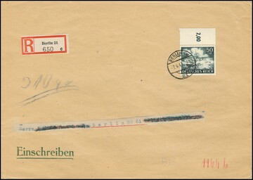 50 Pfg. Wehrmacht vom Rand als seltene Einzelfrankatur auf Orts-R-Brief aus Berlin (telegraphische Adresse teils überschrieben) in der 4. Gewichtsstufe (!) 1943