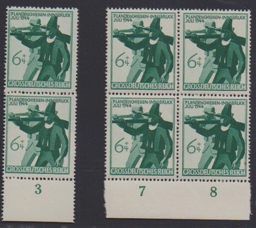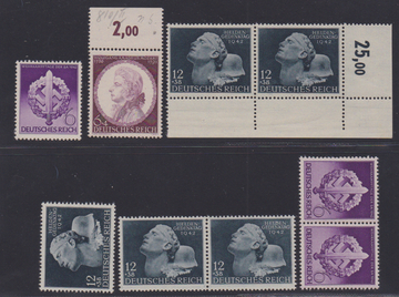 Jahrgänge 1943 bis 1945, Plattenfehler Nr. 863I, 880x (senkrechte Gummiriffelung), 886I, 896I, 897I, II, 901I, 903I, 904I, 906I(3), 907III und VI je postfrisch, gepr. Schlegel, teils innerhalb von Einheiten. Mi. 1200,-