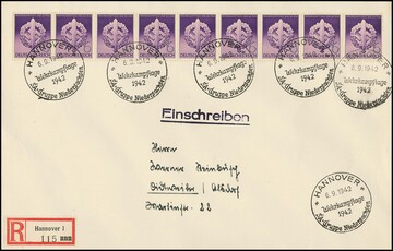 6 Pfg. Wehrkampftage per neun als hohe portoger. Mehrfach-Frankatur (Streifeneinheit) auf Einschreibebrief