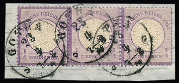 1/4 Gr. violett, Paar und Einzelstück auf Kabinettbriefstück (von Auslands-Drucksache) mit K1 "Gotha", Mi. 430,-