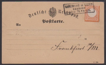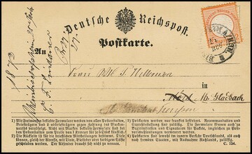 2 Kr. orange, Kabinettstück einzeln auf Postkarte (Adressname radiert) mit Ra3 "Carlsruhe in Baden Bahnhof", spät verwendet am 16.12.1874, sign. Hennies, Schwenn