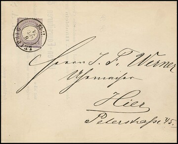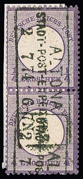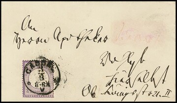 1/4 Gr. violett, unten üblich etwas unruhige Zähnung, einzeln auf Orts-Drucksache mit K2 "Leipzig" 1874, Mi. 700,- +, ferner 1/2 Gr. orange einzeln auf überfrankierter Ortskarte ebenfalls aus Leipzig (hier waren 1/4 Gr. ausreichend)