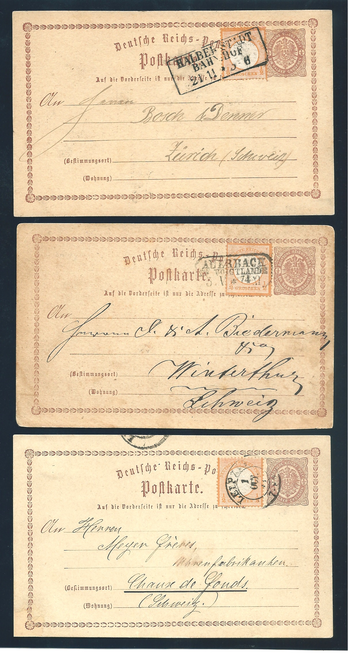 1/2 Gr. orange je als ZuF auf drei Ganzsachenkarten 1/2 Gr. braun, alle an versch. Adressen in der Schweiz. Einmal kl. Mgl., einmal besseres kleines Format L15