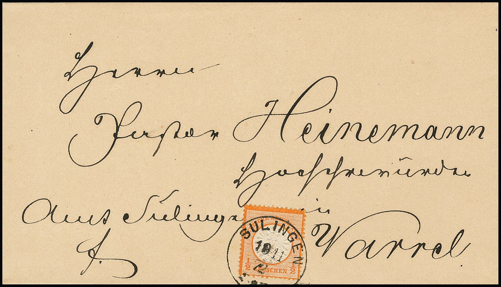 1/2 Gr. orange, sehr schön geprägt, auf Kabinettbrief mit K1 "Sulingen" in den eigenen Landbezirk nach Varrel