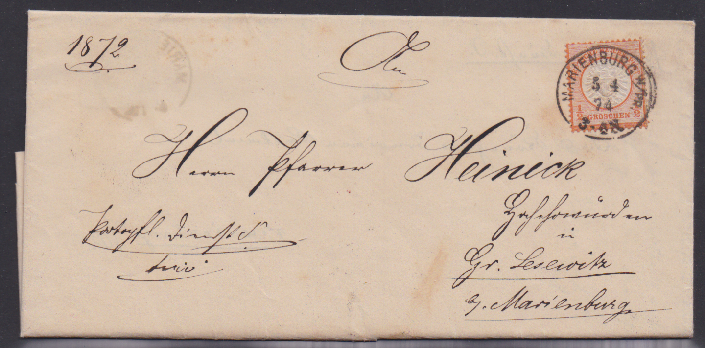 1/2 Gr. orange sowohl innen als auch aussen auf doppelt verwendetem Ortsbereichsbrief, je mit K1 "Marienburg W.Pr.", einmal in den eigenen Landbezirk