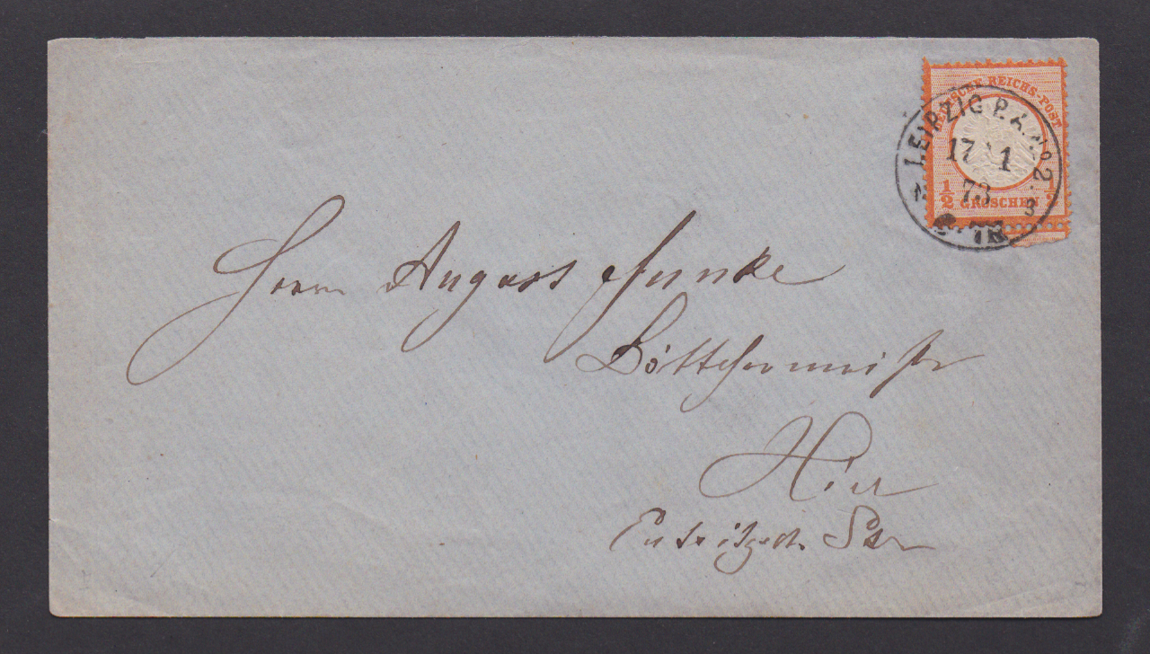 1/2 Gr. orange (kleine Marke L15) und links etwas um den Rand geklebte 2 Gr. blau auf Prachtcouvert (rs. fehlt ein kleines Klappenteil) von Leipzig 1873 nach Christiania/Norwegen