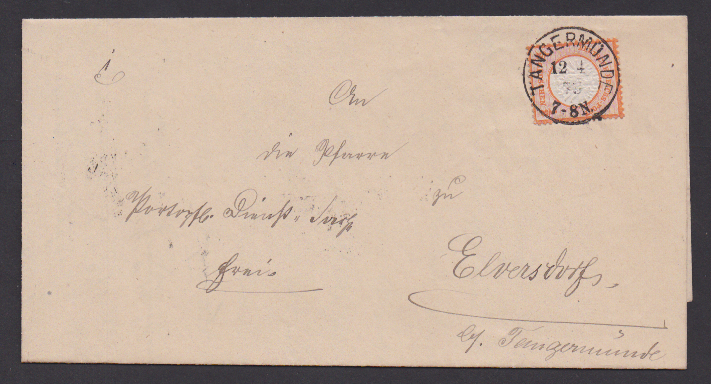 1/2 Gr. orange mit zentr. K1 "Tangermünde" einzeln auf Kabinettbrief in den eigenen Landbezirk nach Elversdorf, ferner einzeln (kl. Spalt) auf Ortsbrief aus Leipzig
