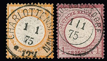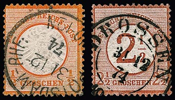 1/2 Gr. orange und 1 Gr. rosa (etwas hell) je mit klaren Stempeln vom Währungsersttag der Pfennigzeit, 1.1.75, K1 "Charlottenbrunn" bzw. K2 "Goerbersdorf"