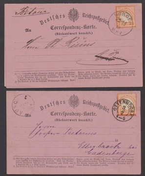 1/2 Gr. orange je auf zwei rosa Doppelkarten ab Norden (K1) bzw. "Otterndorf" (nachverw. K2), auch das Antwortteil je vorfrankiert, aber nicht gelaufen