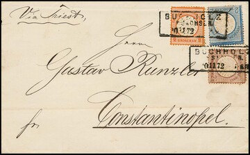 1/2 Gr. orange, 2 Gr. blau und 2 1/2 Gr. rotbraun auf gefaltetem Brief von Buchholz in Sachsen 1872 nach Constantinopel/Türkei, rs. deutscher Ankunftsstempel in Type II. Kleine, ursprüngliche Mängel, seltene Kombination in der 2. Gewichtsstufe, die Nr. 21 zudem frühe Verwendung im Ausgabemonat. Sign. Steuer
