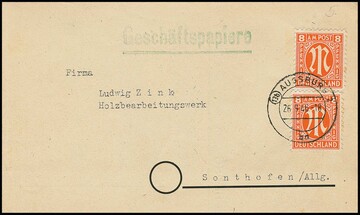 8 Pfg. per zwei als MeF auf Brief "Geschäftspapiere" aus Augsburg, sowie Unterrandpaar mit Plattennummer (alleine Mi. 250,-) nebst ZuF (u.a. Nr. 914POR) auf R-Brief aus Hamburg (siehe Foto)