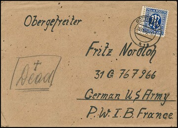 25 Pfg. als portoger. EF auf Kriegsgefangenenbrief von Göttingen 1945 nach Frankreich (Brief noch mit Inhalt). Vs. dezenter Vermerk "Dead" mit Kreuz, rs. deprimierender Vermerk über den Empfänger "Am 6. November 1945 durch Erhängen selbst getötet. Beerdigt St. Andre Militärfriedhof". Mi. 750,-