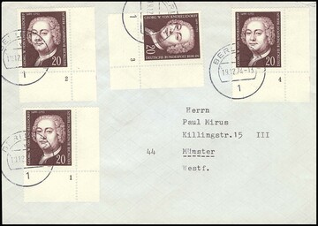 20 Pfg. von Knobelsdorf, vier verschiedene Bogenecken, mit den Formnummern "1" bis "4" vollständig, als sehr ungewöhnliche Mehrfach-Frankatur auf Brief von Berlin 1974 nach Münster