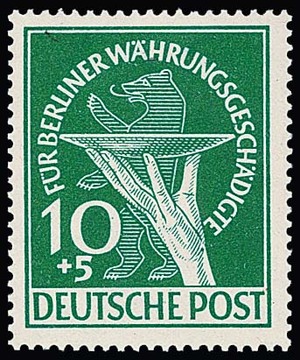 10 + 5 Pf. Währungsgeschädigte mit Plattenfehler "grüner Punkt am Handgelenk" postfrisch (natürlicher Holzeinschluß im Papier kein Mangel), Mi. 400,-