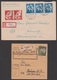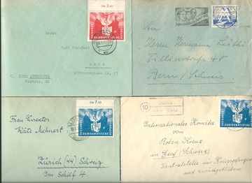 Vier portogerechte Einzelfrankaturen: 50 Pfg. Frühjahrsmesse auf Auslandsbrief in die Schweiz, 24 Pfg. DPF auf Inlandsbrief, sowie zwei Auslandsbriefe mit EF 50 Pfg. DPF in die Schweiz. Mi. 355,-
