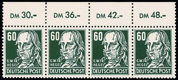 8 Pfg. (zaXII, Oberrand-Besonderheit "fehlendes Zahnloch") sowie 60 Pfg. (vb) je im postfrischen Oberrand-Viererstreifen, sign. Paul bzw. Mayer. Mi. 540,- +