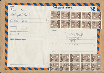 2 Mk. Ulbricht, Großformat, per zwanzig (zwei Zehnerblöcke) als seltene Mehrfach-Frankatur, auf nur kurzzeitig möglichem "Datapost-Inland"-Brief von Berlin 1990 nach Leipzig