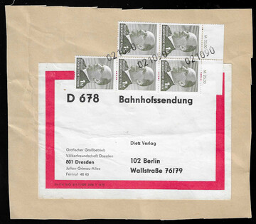 1 M. Ulbricht im Oberrand-Fünferblock als gute Mehrfach-Frankatur im Aufbrauch auf Bahnhofs-Sendungs-Päckchen-Adresse von Dresden, 2.10.90 (!), nach Berlin