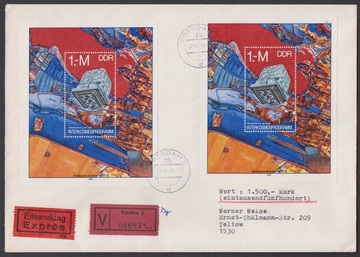 Interkosmos-Block 1978 per zwei als ungewöhnliche Mehrfach-Frankatur auf Wert-Expreßbrief aus Potsdam 1989