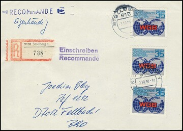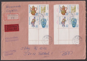 Meissener Porzellan, der Zusammendruck-Viererblock per zwei als gute Mehrfach-Frankatur auf Reco-Expreßbrief aus Stolberg 1988