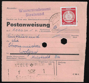 Dienst A, Verwaltungspost B, 30 Pfg. Zirkelmarke per vier, vs./rs., als gute MeF auf Postanweisung aus Stralsund 1959, sign. Paul