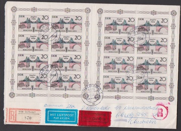 20 Pfg. historische Brücken, der Kleinbogen in guter Type II per zwei als Mehrfach-Frankatur auf Übersee-Lupo-Expreß-R-Brief aus Stolberg