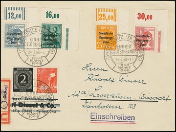 12, 16, 25 u. 30 Pfg. Maschinen-Aufdruck je aus der rechten oberen Bogenecke, als Zehnfach-Frankatur nebst 2 u. 8 Pfg. Kontrollrat auf portoger. R-Brief vom 24.7.48 von Gössnitz nach Leverkusen