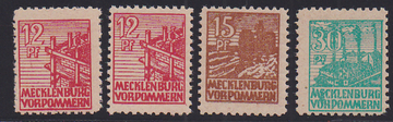Abschied auf Kreidepapier in postfrischen Viererblöcken, dabei 3 Pfg. mit Druckerzeichen, Mi. 600,- + DZ