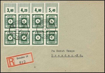 6 Pfg. im Oberrand-Achterblock, gute Variante "nur waagerecht durchstochen", auf seitlich geöffnetem Kempe-R-Brief, jeder Viererblock sehr schön zentr. "Dresden" entwertet. Mi. lose 1200,- ++ (Plattenfehler VIII auf Feld 17), sign. Ströh