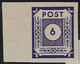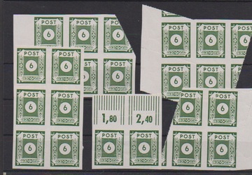 6 Pfg., sechs Einheiten mit Durchstich-Abarten: zwei Sechserblöcke nur mit diagonalem bzw. einmal schrägem Durchstich, Oberrandpaar nur schräg waagerecht durchstochen, sowie zwei Viererblöcke nur mit diagonalem Durchstich, je sign. Ströh. In dieser Form ungewöhnlich und im Michel nicht bewertet!