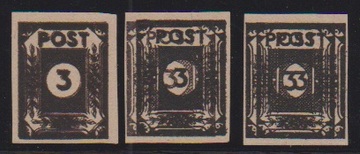 3 Pfg., drei versch. postfrische Doppel- bzw. Dreifachdrucke, u.a. dunkelbraun auf braun, Mi. 320,-