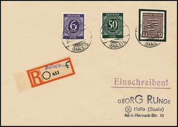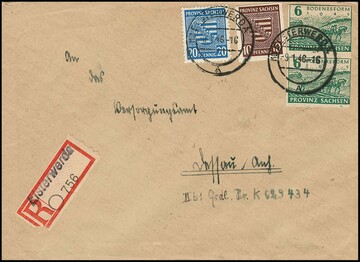 10 Pfg. geschnitten mit Plattenfehler "dünnerer linker Rand" (Feld 49), nebst ZuF (Paar 6 Pfg. Bodenreform etwas berührt) auf R-Brief von Elsterwerda, 9.1.46, nach Dessau, Mi. 700,- +