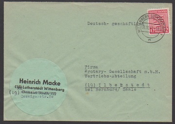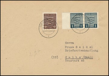 10 Pfg. geschnitten, nebst Randpaar 1 Pfg., auf portogerechtem Brief aus Magdeburg, 12.2.46, Mi. 500,-
