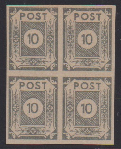 10 Pfg. Ziffern, "wa"-Papier im postfr. Viererblock, sowie gute "c"-Farbe mit Spargummi ungebraucht, sign. bzw. Fotoexp. Jasch. Mi. 580,-