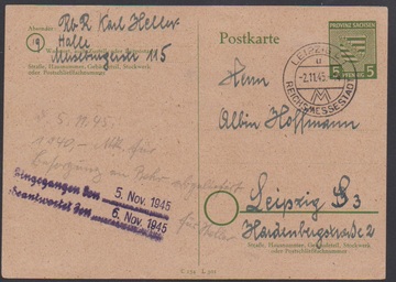 Ganzsachenkarte 5 Pfg. Provinz Sachsen als tadellose Orts-Karte aus Leipzig mit viel Bedarfstext. Mi. 150,-