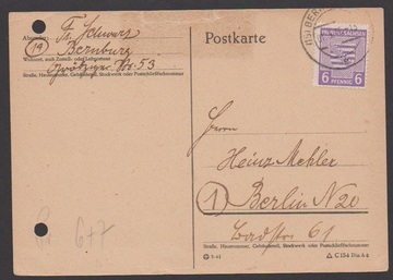 6 Pfg. rötlichgrauviolett, gute Farbe, Wz. "Y", tadellos, auf Postkarte (diese gelocht und rs. Klebestreifen) mit Stempel "Bernburg 1e", 1.3.46 nach Berlin, Fotoexp. Schulz "echt und einwandfrei". Mi. 250,- für lose gest., 500,- für Karte
