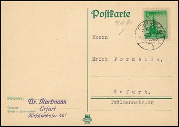 5 Pfg. Thüringen in besserer Variante als portoger. EF auf Orts-Postkarte aus Erfurt, sign. Ströh.