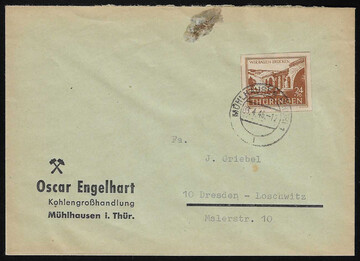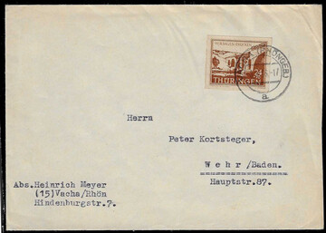 24 + 75 Pfg. Brückenbau in guter Farbe mittelrötlichbraun als portogerechte Einzelfrankatur auf Fernbrief aus Vacha, Fotoexp. Jasch. Mi. für billige "a" schon 180,-