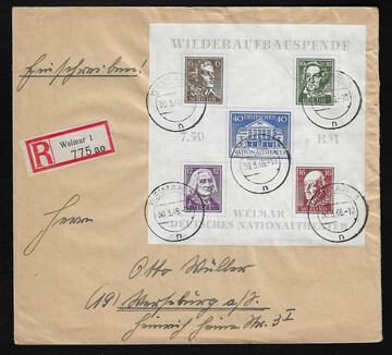 Theater-Block geschnitten einzeln auf portoger. R-Brief aus Weimar mit den üblichen Gebrauchsspuren, sign. Jasch. Mi. 250,-