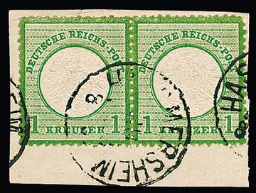 "Hassmersheim", nachverw. K1 auf Briefstück mit üblich gez. Paar 1 Kr. gr. Brustschild, Fotoexp. Sommer ("tadellos")