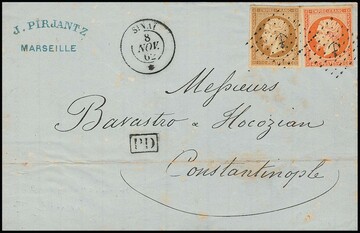 10 C. gelbbraun und 40 C. orange, gut gerandete Prachtstücke auf etwas fleckigem Faltbrief 1862 mit Ankerstempel und Neben-K2 "Sinai" nach Constantinopel