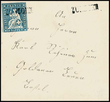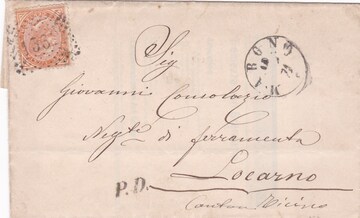 10 C. orangebraun (ein Zahn) auf Faltbrief mit NS "332" und Neben-K1 1871 im Grenzrayon von Margno nach Locarno/Schweiz