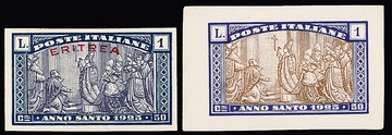 20 C. Heiliges Jahr 1924, sechs ungezähnte Probedrucke, davon einer mit Aufdruck "Eritrea"