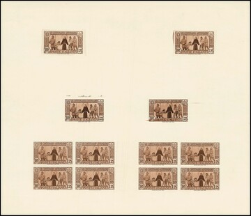 1,25 L. braun, vollständiger Probedruck-Kleinbogen auf Kreidepapier mit zwei Viererblöcken und vier einzeln gedruckten Werten