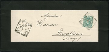 5 C. grün einzeln auf dekor. Auslands-Trauer-Drucksache von Barletta 1893 nach Trondheim/Norwegen, seltene Destination