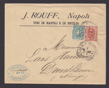 5 C. grün und 20 C. rotorange (kl. Randfehler) auf Vordruckbrief von Neapel 1908 nach Trondheim/Norwegen, dazu Briefadresse mit 10 u. 25 C. an die gleiche Adresse